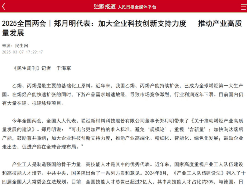 鄭月明代表建議:出臺更加嚴(yán)格的行業(yè)準(zhǔn)入標(biāo)準(zhǔn),控制乙烯、丙烯新增產(chǎn)能,避免“規(guī)模論”,重視“含新量”,并加強(qiáng)行業(yè)監(jiān)管力度,確保相關(guān)政策落實(shí)到位;加快淘汰落后產(chǎn)能,推動產(chǎn)業(yè)升級,鼓勵企業(yè)通過兼并重組、產(chǎn)能置換等方式,優(yōu)化產(chǎn)業(yè)布局,提高產(chǎn)業(yè)集中度;加大企業(yè)科技創(chuàng)新支持力度,推動行業(yè)高質(zhì)量發(fā)展,鼓勵企業(yè)加大研發(fā)投入,進(jìn)行技術(shù)設(shè)備升級改造,提高產(chǎn)品附加值,推動產(chǎn)業(yè)高端化、綠色化、差異化、精細(xì)化發(fā)展;鼓勵企業(yè)走出去,促進(jìn)產(chǎn)能在全球合理布局,拓展發(fā)展空間。