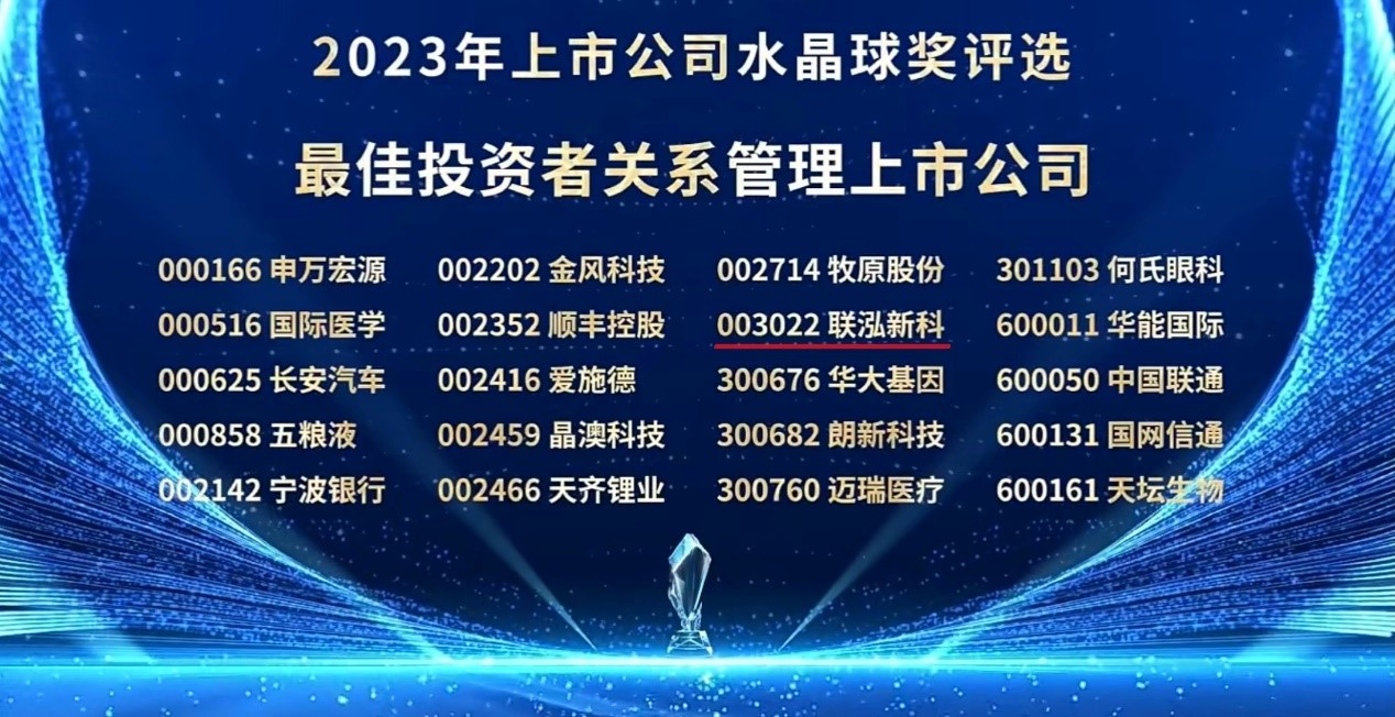 水晶球獎評選范圍包括A股和港股上市公司,10位上市公司領(lǐng)導(dǎo)人獲評“2023年度最佳總裁/總經(jīng)理/CEO”,40家上市公司獲評“2023年最佳投資者關(guān)系管理上市公司”。未來,聯(lián)泓新科將繼續(xù)提升公司治理和投資者關(guān)系管理水平,努力為投資者創(chuàng)造更大價值。